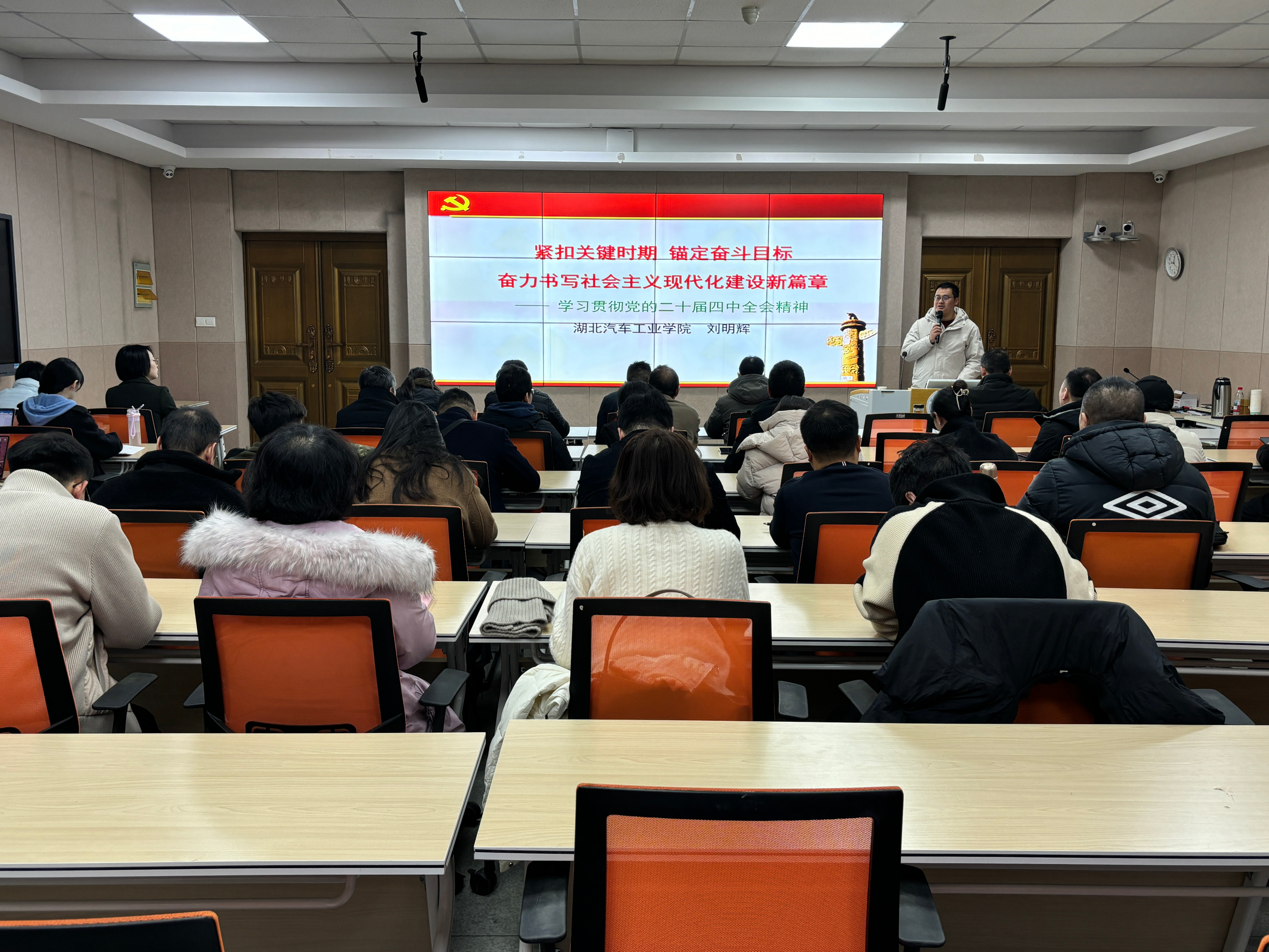 于1305教室举办党的二十届四中全会精神专题学习,特邀学校宣讲团刘明辉博士以“紧扣关键时期锚定奋斗目标奋力书写社会主义现代化建设新篇章”为主题,深入解读党的二十届四中全会精神以及“十五五”时期发展规划。